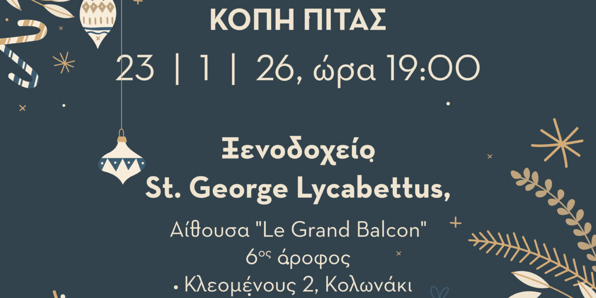 Σας προσκαλούμε στην κοπή πρωτοχρονιάτικης πίτας που θα πραγματοποιηθεί στις 23/01/2026 και ώρα 19:00 στην αίθουσα Le Grand Balcon, 6ος όροφος του ξενοδοχείου St.George Lycabettus στην οδό Κλεομένους 2, Κολονάκι