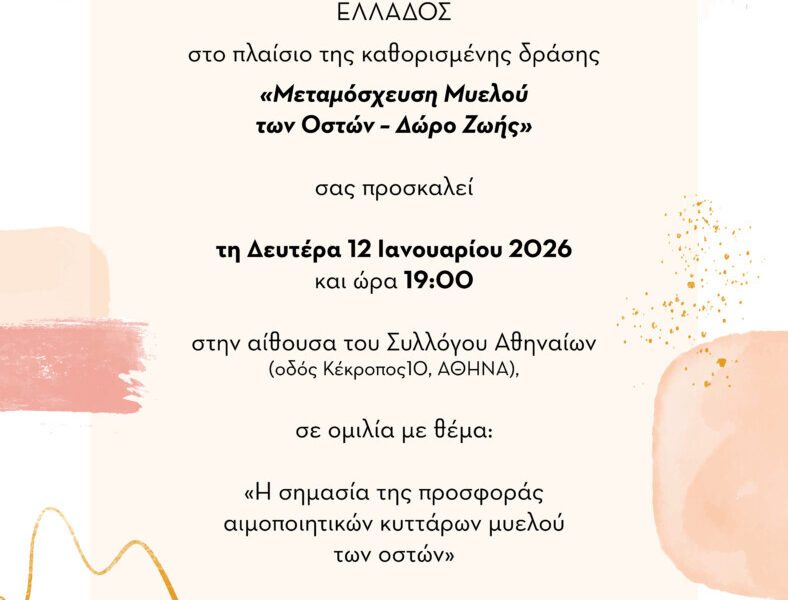 Η Σοροπτιμιστική Ένωση Ελλάδος στο πλαίσιο των δράσεών της, σας προσκαλεί τη Δευτέρα 12 Ιανουαρίου 2026 και ώρα 19:00 στην αίθουσα του Συλλόγου Αθηναίων (οδός Κέκροπος, 10) σε ομιλία με θέμα “Η Σημασία της προσφοράς αιμοποιητικών κυττάρων μυελού των οστών” με ομιλητή τον Επιστημονικό Διευθυντή του Κέντρου Εθελοντών – Δοτών Μυελού των Οστών του Συλλόγου “Όραμα Ελπίδας”, Παιδίατρου – Αιματολόγου,